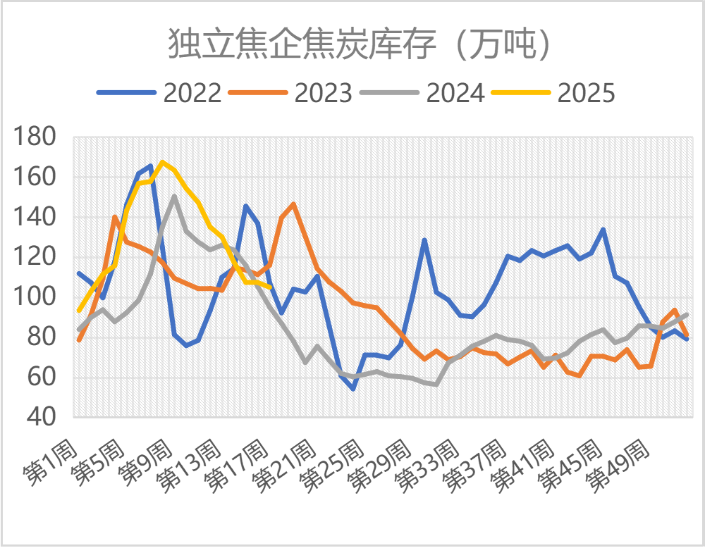 正如上文所言,4月焦企生产积极性尚可,独立焦企开工和产能利用率均出现小幅回升。这一方面得益于提涨后焦企利润情况小幅好转,另一方面,则源于下游铁水刚需支撑,焦炭出货情况较为顺利。