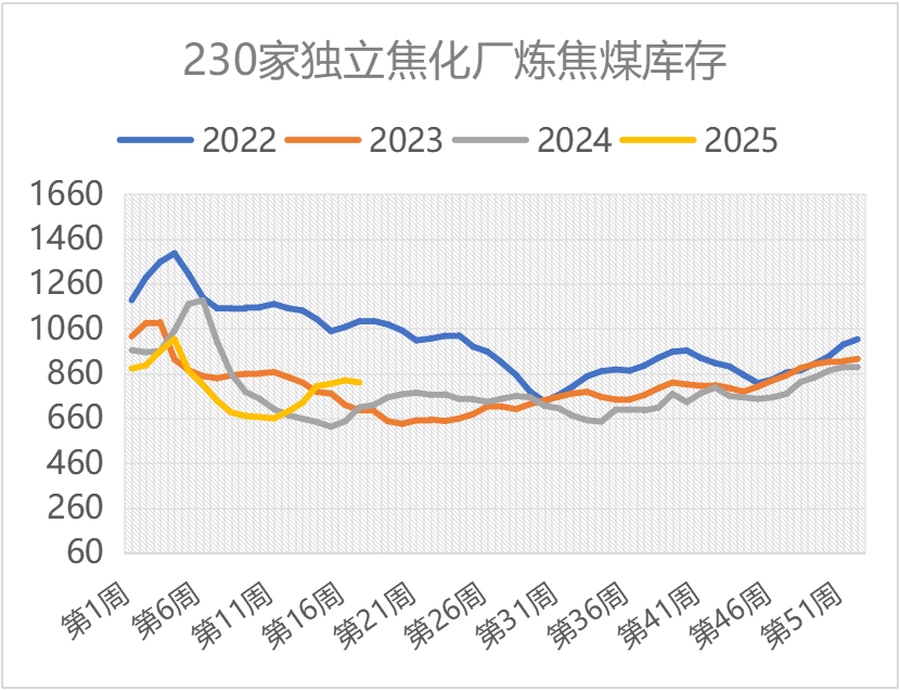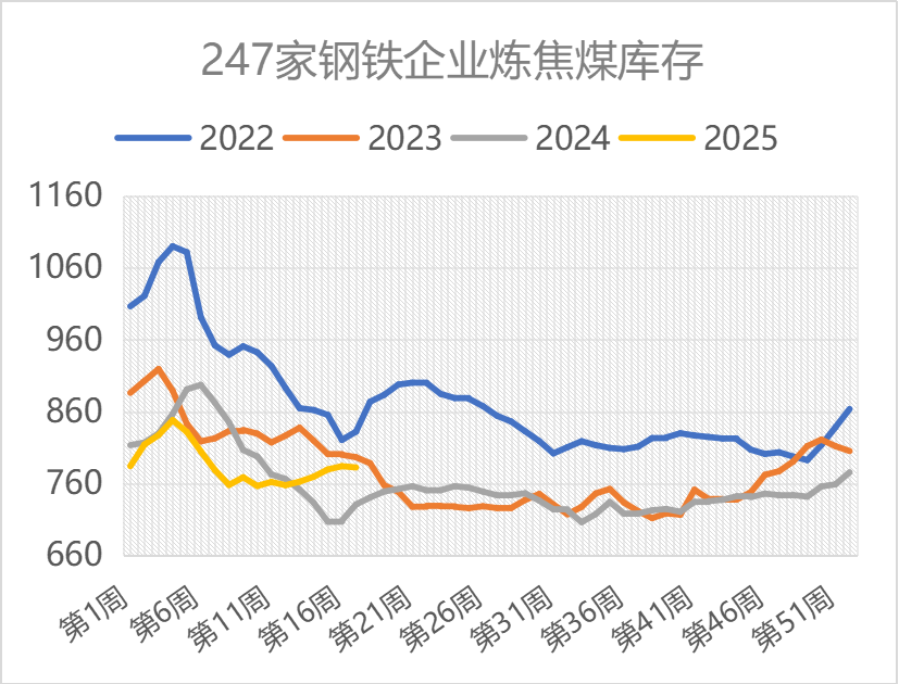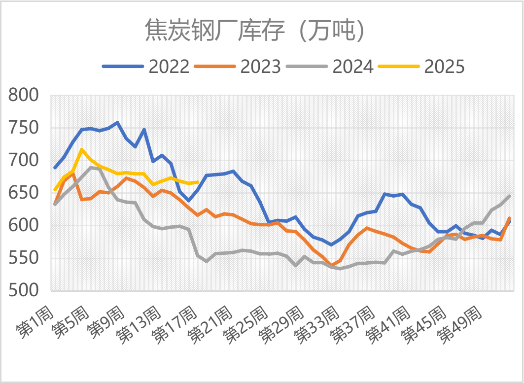 高铁水给予焦炭刚需支撑,也成为焦炭基本面略好于焦煤的重要因素。4月焦炭供需均出现回升,焦企库存明显去化,下游钢厂焦炭库存持稳运行。根据4月25日当周数据,焦企焦炭库存104.87万吨,钢厂焦炭库存666.35万吨。