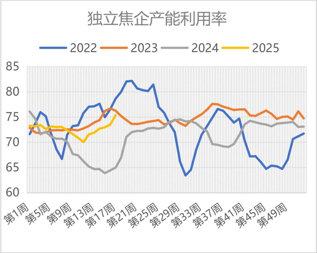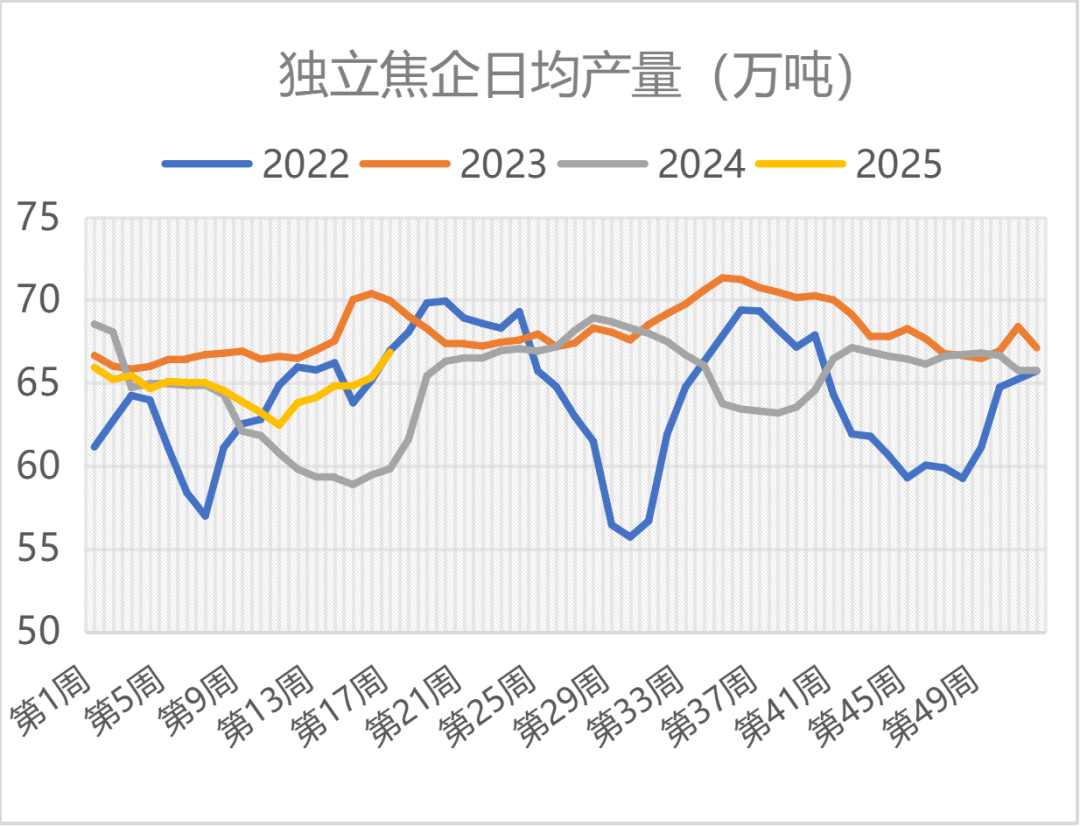 4月以来,随着焦炭开启一轮提涨,叠加下游旺季来临,低迷的煤焦市场情绪出现一定回暖。4月焦企开工较3月出现一定回升。根据4月25日当周数据,独立焦企产能利用率75.36%,与3月末相比,增加3.46个百分点。独立焦企焦炭产量66.85万吨,环比3月末数据增加2.72万吨。