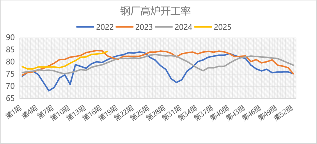 从数据上来看,其实今年钢厂复产速度快于去年,铁水产量的高点也明显高于去年同期。根据4月25日当周数据,钢厂高炉开工率84.33%,与3月底相比增加2.22个百分点。最新一周铁水日均产量回升至244.35万吨,与3月底相比增加7.07万吨。