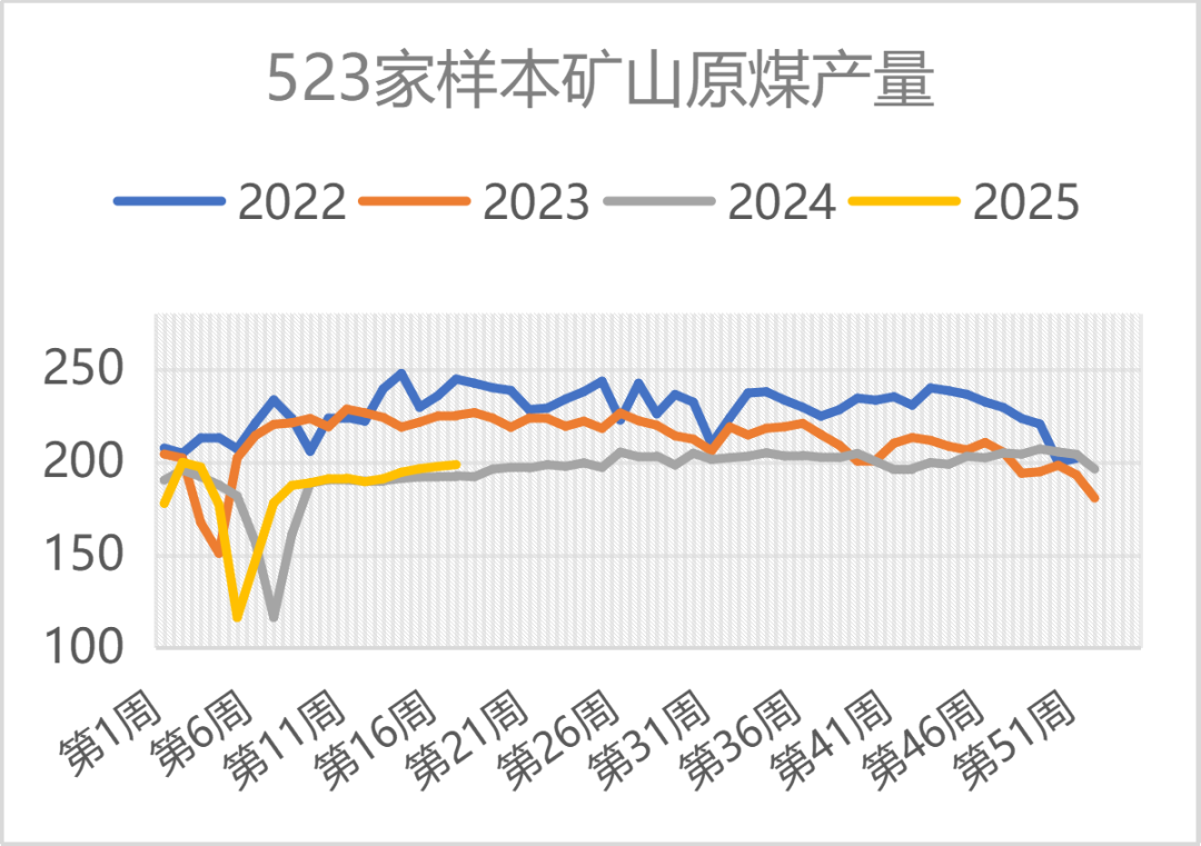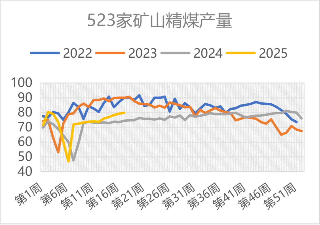 今年国内煤安监力度明显弱于去年,产地煤矿生产正常进行。从数据来看,4月以来,矿山原煤和精煤产量均出现一定程度回升。根据4月25日当周数据来看,矿山原煤日均产量回升至198.64万吨,精煤日均产量回升至79.74万吨。