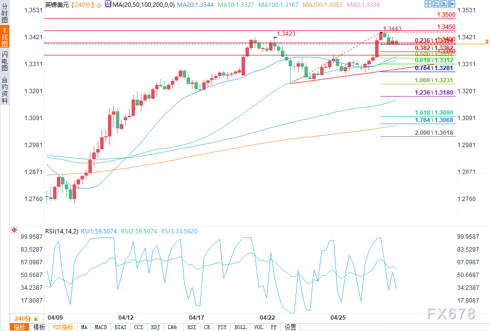 从4小时图来看,英镑兑美元汇率稳定在1.3250上方。此前英镑兑美元开启新一轮涨势,先后突破了1.3320和1.3330,进入上行区间。
