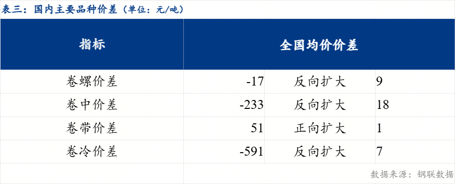从品种价差来看,卷螺差较上一交易日反向扩大9元/吨,热中价差较上一交易日反向扩大18元/吨,热带价差较上一交易日正向扩大1元/吨,热冷价差较上一交易日反向扩大7元/吨。
