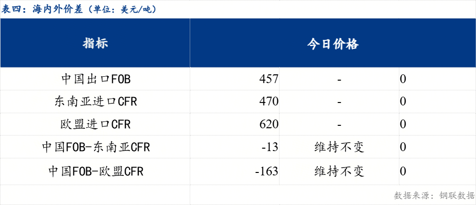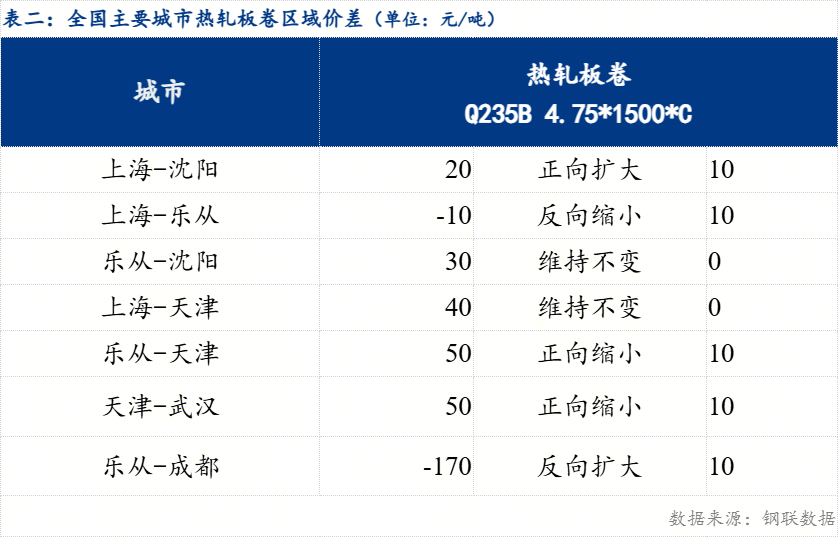 从区域价差来看,华东与东北价差20元/吨,较上一交易日正向扩大10元/吨;华东与华南价差-10元/吨,较上一交易日正向缩小10元/吨;华南与华北价差50元/吨,较上一交易日正向缩小10元/吨。