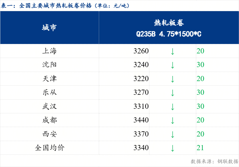 今日热轧板卷全国主要城市价格小幅下行,截止发稿时3.0mm热轧板卷全国均价3396元/吨,较上一交易日下跌21元/吨;4.75mm热轧板卷全国均价3340元/吨,较上一交易日下跌21元/吨。分区域来看,今日各区域普遍下行,跌幅在20-40元/吨之间。今日黑色商品期货震荡弱势运行,10合约收跌1.26%,期货市场早盘开盘持续回调,现货市场普遍下跌,午后盘面继续弱势下行,部分市场午后继续下调报价,市场成交情况有一定程度转弱,各区域商家普遍下调报价,全日成交情况较弱。