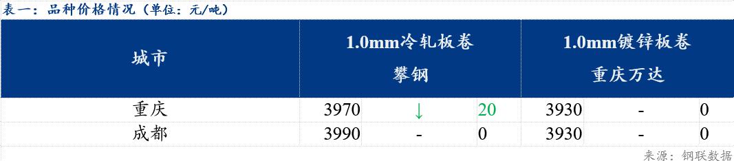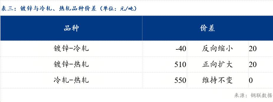 重庆、上海地区冷轧板卷区域价差维持不变,重庆、广州冷轧板卷区域价差扩大20元/吨;重庆、上海镀锌板卷区域价差扩大10元/吨,重庆、广州镀锌板卷区域价差扩大10元/吨。镀锌、冷轧品种价差反向缩小20元/吨;镀锌、热轧品种价差扩大20元/吨;冷轧、热轧品种价差维持不变。