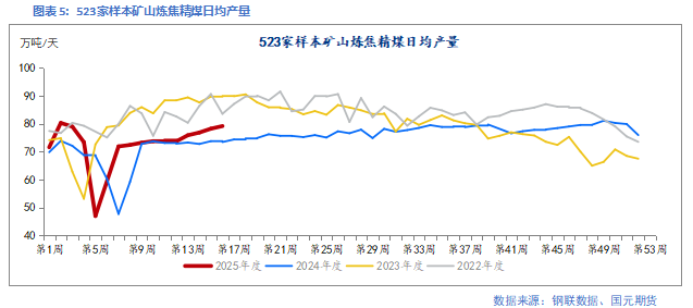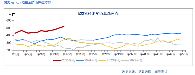 上游矿山原煤库存连续累库,库存消化压力较大。上周247家钢厂焦煤库存为784.23万吨,周环比增加0.59%;270家独立焦化厂焦煤库存为976.13万吨,周环比增加1.08%;港口焦煤库存为348.92万吨,周环比下降3.31%;截至4月18日,矿山精煤库存为333.34万吨,周环比下降0.65%;矿山原煤库存为516.78万吨,周环比增加2.43%。