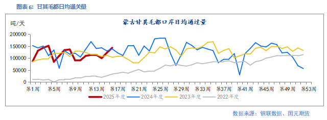 上周,523家炼焦煤矿山开工率为87.7%,周环比增加0.54个百分点;原煤日均产量为197.66万吨/天,周环比增加0.63%;精煤日均产量为79.18万吨/天,周环比增加1.20%。110家样本洗煤厂开工率为61.9%,周环比下降0.8个百分点;洗煤厂精煤日均产量为52.095万吨/天,周环比下降1.44%;甘其毛都口岸日均通关量为 143478.0 吨/天,周环比增加 16.82%。