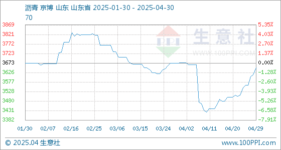 4月30日,生意社沥青基准价为3650.00元/吨,与本月初(3675.20元/吨)相比,下降了-0.69%。