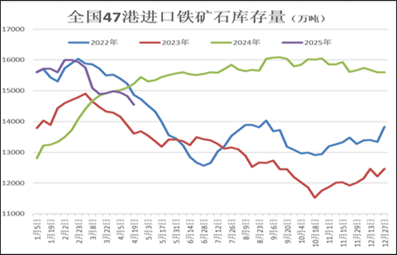 据澳大利亚气象局数据显示,2025年一季度是自1998-99年以来最恶劣的风暴季节。当季,共有六场强热带气旋,影响澳洲主流矿山铁矿石生产和发运。另外,巴西强降雨同样影响淡水河谷生产和发运。据Mysteel统计数据显示,2025年一季度澳巴铁矿石发运量为26926万吨,去年同期为27387万吨,同比减少461万吨。另外,一季度,国内47港铁矿石到港量为29168万吨,去年同期为31680万吨,同比减少2512万吨。