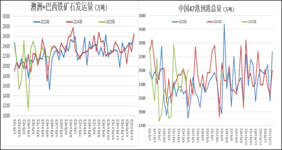 然而,随着时间推移,澳洲和巴西恶劣天气对铁矿石生产和发运影响在逐渐减弱。最近一期,发运量增加320.7万吨,到港量增加230.4万吨。结合季节性规律及天气情况预计,5月份澳巴铁矿石发运量周均值或超2300万吨,而47港到港量周均值同样或超2300万吨。