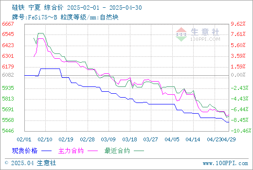 4月初在关税的影响下,硅铁行情走势不稳,虽然青海、甘肃、陕西等部分地区硅厂减停产、避峰生产等消息不断传出且范围逐步扩大,日产量有所减少,但市场需求状况依然疲软,实际成交跟进缓慢,部分采购商心理采购价格较低存在一定的压价情绪。再空信息依然较多。对整体行情形成压制的情况下,硅铁4月份行情下行。据生意社商品行情分析系统,4月30日硅铁(牌号:FeSi75~B;粒度等级/mm:自然块)宁夏地区市场报价在5400-5600元/吨,市场均价5548元/吨,较月初跌3.55%。