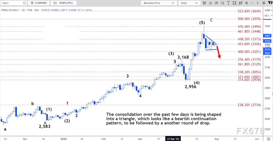 鉴于从 2583 美元开始的五浪周期已经完成,金价可能在未来一两周内回撤至 2956 美元至 3168 美元之间的第四浪区域。