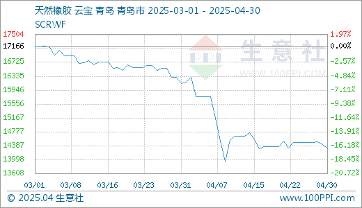 据生意社商品行情分析系统,4月以来国内天然橡胶现货市场行情小幅走低,截止到4月30日我国天然橡胶市场现货胶行情在14458元/吨左右,较月初的16172元/吨下跌了10.60%。4月下游全钢胎开工小幅走低半钢胎开工稳定,对天然橡胶刚需支撑;天然橡胶原料行情大幅回落,天然橡胶成本仍支撑走弱;随着国内外天然橡胶供应由低产期逐渐进入增产期,国内天然橡胶库存延续小幅增加态势,对天然橡胶行情形成利空影响。