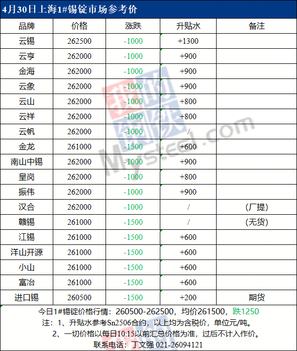 4月30日Mysteel上海现货锡锭报价260500-262500元/吨,均价261500元/吨,较上一交易日跌1250元/吨,Mysteel15:30上海现货锡锭成交价格260500-262500元/吨,均价261500元/吨,较上一交易日持平。