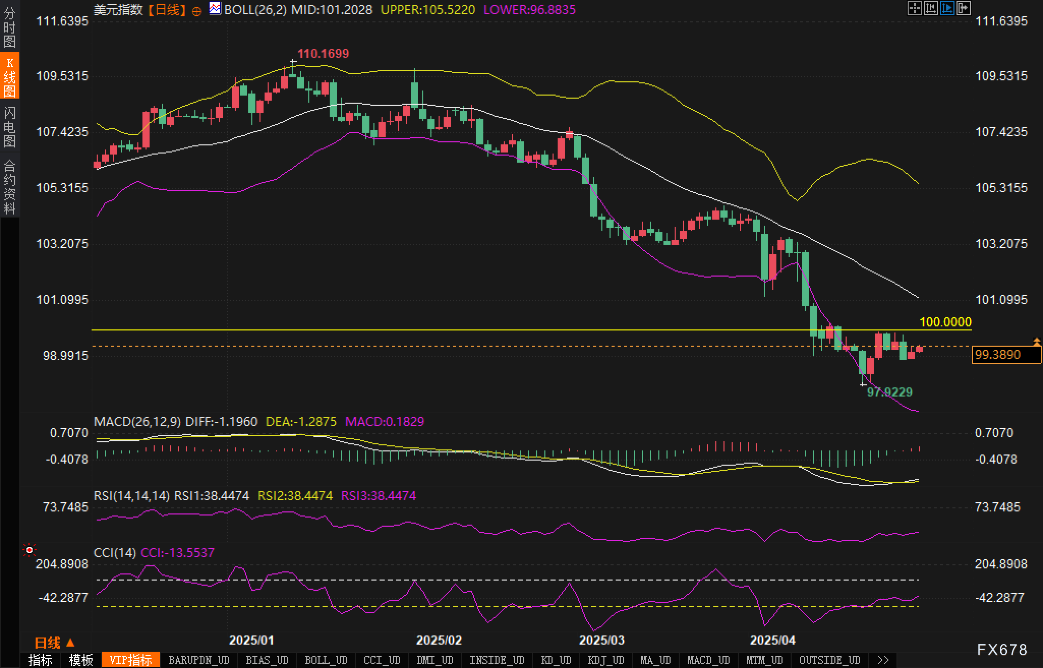 美元指数日线图显示明显的下行趋势,目前交投于99.40附近,远低于200日和200周简单移动平均线,这两条均线分别位于104.48和102.70。指数在4月21日创下97.92的年内低点后出现技术性反弹,但动能不足。MACD指标呈现负值,差值为-1.1960,确认了下行趋势的持续性。