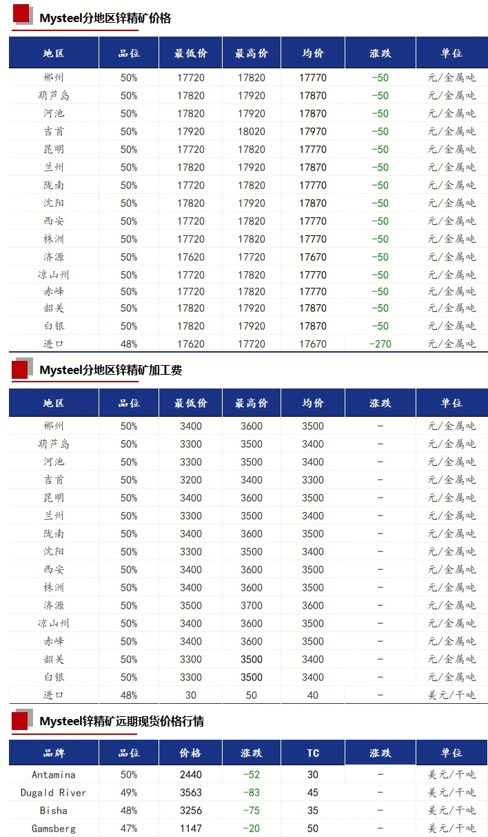 今日受锌价的影响,锌精矿价格下跌50元/金属吨。国内锌精矿加工费各地区均未调整,和上一交易日持平。进口TC市场主流报价在30-50美元/干吨,和上一交易日持平。