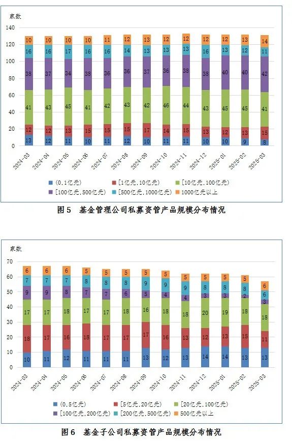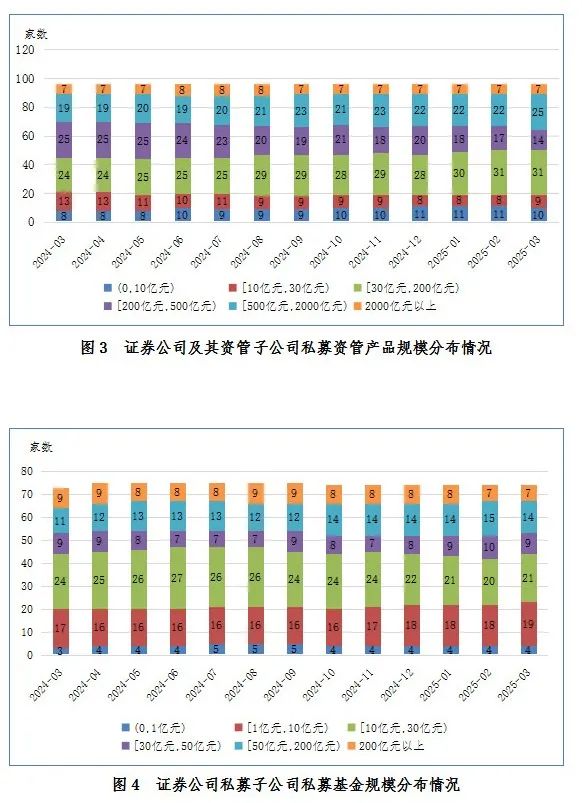 截至2025年3月底,证券公司及其资管子公司平均管理私募资管产品规模553.94亿元,管理规模中位数186.22亿元;证券公司私募子公司平均管理私募基金82.75亿元,管理规模中位数为21.60亿元;基金管理公司平均管理私募资管产品规模350.91亿元,管理规模中位数101.53亿元;基金子公司平均管理私募资管产品规模173.24亿元,管理规模中位数32.79亿元;期货公司及其资管子公司平均管理私募资管产品规模31.01亿元,管理规模中位数2.52亿元。(证券期货经营机构管理私募资管产品规模分布情况见图3至7)