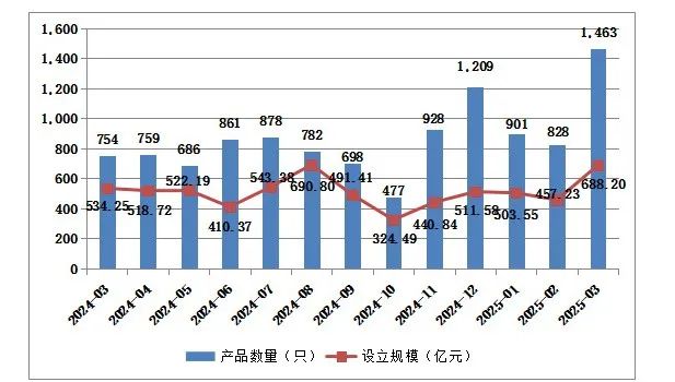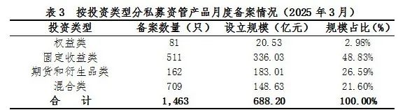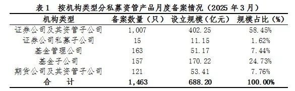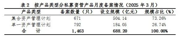 2025年3月,证券期货经营机构共备案私募资管产品1,463只,环比增加76.69%,同比增加94.03%;设立规模688.20亿元,环比增加50.51%,同比增加28.82%(见图1)。