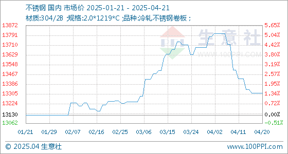 4月21日生意社不锈钢基准价为13312.50元/吨