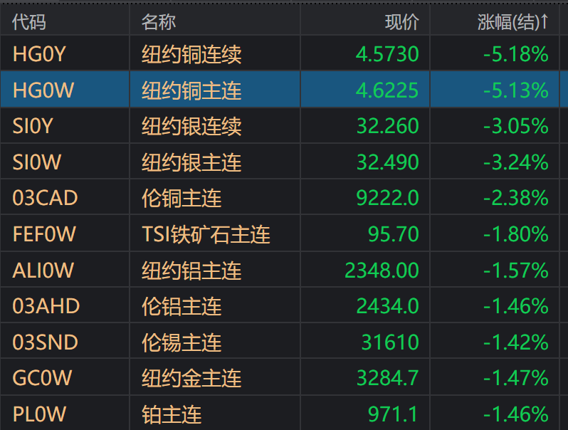 基本金属全线下跌。纽约铜主力合约大跌超5%。伦铜、伦铝、伦锡等金属商品均跌超1%。