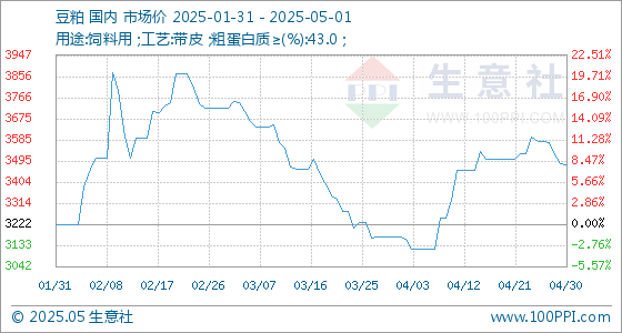 5月1日生意社豆粕基准价为3476.67元/吨