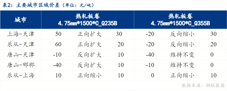 从区域价差来看,4.75mm普卷华南与华北价差60元/吨,华东与华北价差50元/吨,华南与华东价差10元/吨。京津冀地区价差来看,唐山与天津价差-10元/吨,唐山与邯郸价差-40元/吨 。