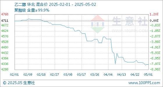 5月2日,生意社乙二醇基准价为4331.67元/吨,与本月初持平。