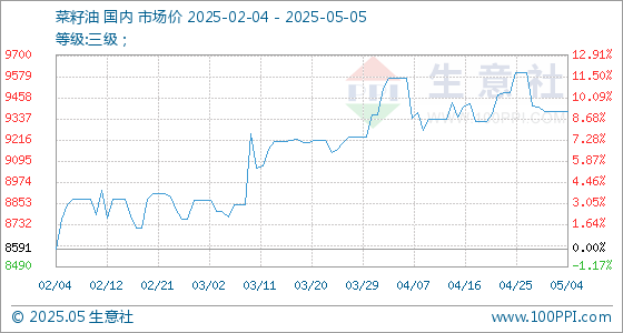 5月5日,生意社菜籽油基准价为9378.33元/吨,与本月初持平。