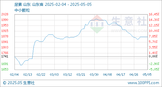 5月5日,生意社尿素基准价为1875.00元/吨,与本月初持平。
