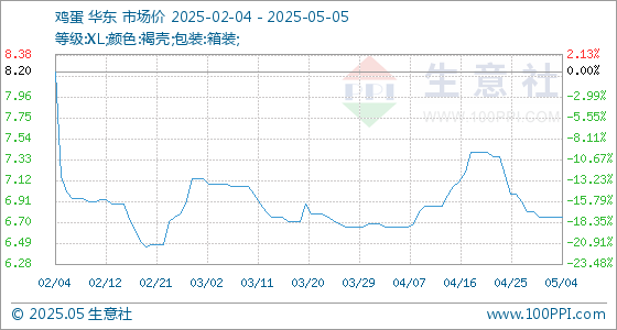 5月5日,生意社鸡蛋基准价为6.75元/公斤,与本月初持平。
