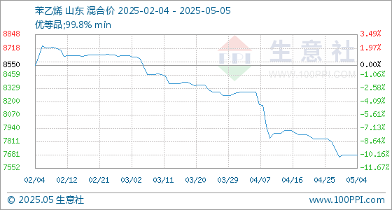 5月5日,生意社苯乙烯基准价为7680.00元/吨,与本月初持平。