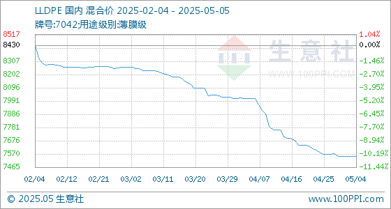 5月5日,生意社LLDPE基准价为7553.33元/吨,与本月初持平。