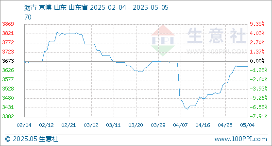 5月5日,生意社沥青基准价为3647.50元/吨,与本月初持平。