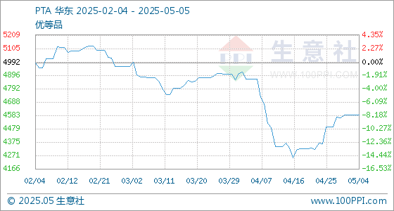 5月5日,生意社PTA基准价为4584.38元/吨,与本月初持平。