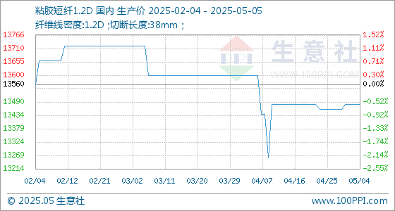 5月5日,生意社粘胶短纤1.2D基准价为13480.00元/吨,与本月初持平。