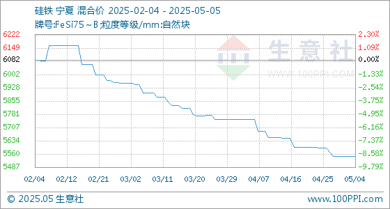 5月5日,生意社硅铁基准价为5548.57元/吨,与本月初持平。