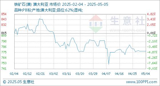 5月5日生意社铁矿石(澳)基准价为778.11元/吨