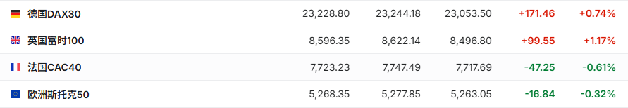 2. 截至发稿,德国DAX指数涨0.74%,法国CAC40指数跌0.61%,欧洲斯托克50指数跌0.32%。