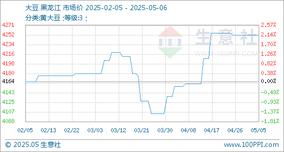 5月6日,生意社大豆基准价为4252.00元/吨,与本月初持平。