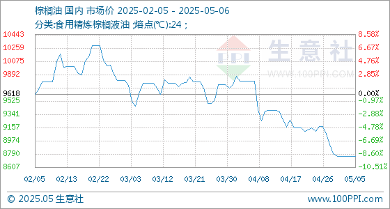 5月6日,生意社棕榈油基准价为8760.00元/吨,与本月初持平。