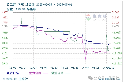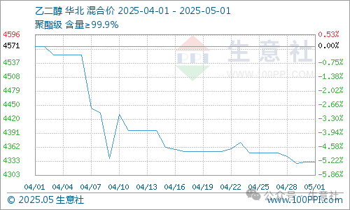 2025年4月乙二醇价格下跌。据生意社数据显示,截止5月1日,国内油制乙二醇均价为4331.67元/吨,较4月1日均价4571.67元/吨,下跌5.25%。