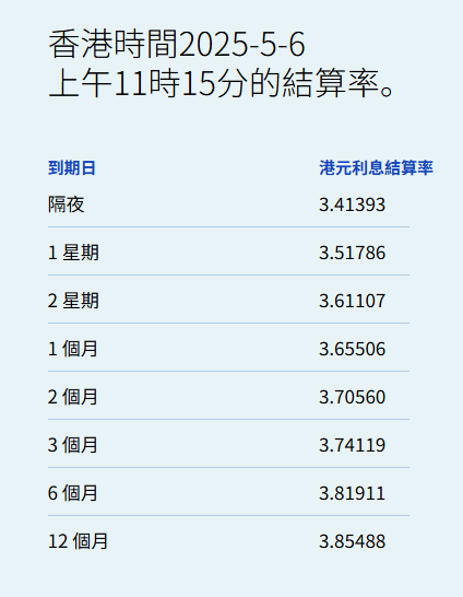 5月6日,香港金管局持续向市场注资,港元拆息今日全线下跌,其中,隔夜息大幅回落近89基点至3.41393%,见两周新低,与楼按相关的一个月拆息亦回落33基点,报3.65506%,同样见4月22日后最低。反映银行资金成本的三个月拆息报3.74119%,是2023年5月2日后最低。六个月及一年期分别降至3.81911%及3.85488%。