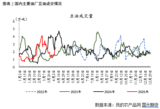 4月以来,受中美关税问题以及生物燃料动向影响,国内豆油期货市场波动加剧,整体呈现弱势运行。清明节后,受美国“对等关税”政策及我国反制措施影响,宏观系统性风险拖累以及原油价格迅速走低带动生物燃料需求受挫,油脂板块整体大幅低开。随后,随着中美贸易冲突升级,市场对贸易局面的影响预期开始淡化,豆油期货在经历短期大幅下跌后,于上周迎来了阶段性的低位企稳反弹格局。