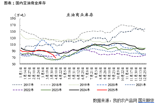 不过4月份以后,随着南美大豆收割结束后集中上市,国内二季度进口大豆预计大量到港。根据国家粮油信息中心数据显示,截至4月8日,我国已采购5月船期大豆900万吨,当月采购完成率83%。6-8月船期大豆采购量分别为570万吨、180万吨和30万吨。船期监测显示,4月下旬我国进口大豆将开始集中到港,预计4月进口大豆到港量850万吨,5月1200万吨,6月1100万吨,二季度国内大豆供应将转向宽松。一季度大豆供应相对紧张导致油厂开机有限,豆油库存短期呈现下滑趋势。据Mysteel调研显示,截至2025年4月11日,全国重点地区豆油商业库存69.39万吨,环比上周减少9.73万吨,降幅12.30%。同比减少16.77万吨,跌幅19.46%。从需求端来看,目前豆油消费端无增量消费消耗供给,需求平淡,限制了豆油现货涨幅。