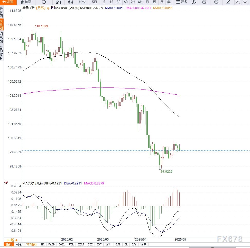 美元指数在触及99.70附近阻力后回落,目前交投于99.50区域。4小时图上,价格自4月高点100.15以来震荡下行,并形成一个轻微下倾的通道,表明多头动能正在减弱。