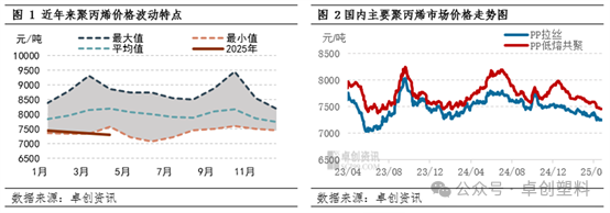 而驱动本月价格的主要因素在于宏观引发的成本端变动和需求持续偏弱的施压。具体来看,上旬在关税贸易战消息的影响下,国际油价持续下跌,油制PP成本端支撑随之走弱,而同时关税消息也使得下游终端部分领域的接单节奏再度放缓,下游对后期预期更为悲观,投机需求寥寥,拖累PP价格。但月内供应压力相对不大,新投产能暂无兑现,加之检修较为集中,中上游延续积极去库战略,库存压力可控助力前端货源消化,且丙烷价格随关税消息上升也对市场提供一定成本支撑,进一步避免了价格下跌幅度。中下旬伴随特朗普关税政策缓和,市场情绪有所修复。因而整体看,本月价格震荡走弱,但跌幅相对有限。