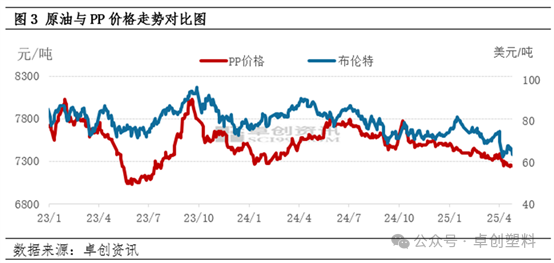 月内油制PP成本环比下跌。原油偏弱震荡为主,一方面,“对等关税”引发市场对美国“衰退“预期升温及全球经济拖累下需求恶化前景的担忧,另一方面OPEC+对5月超预期增产使得油市情绪连续受到打击,截至4月25日,布伦特原油降至66.87美元/桶,原油下跌使得油制PP成本环比下跌4.09%。而作为另一主要来源丙烷,“关税消息”对其影响更大,进口丙烷因纯度更高因而在PDH制企业中应用更为集中,从成本方面而言,若增加关税则会导致丙烷价格上涨使得企业利润亏损扩大,月内受丙烷预期偏紧影响,价格有所抬升,PDH制PP成本环比上涨1.59%。成本端来看,市场施压与支撑阶段性并存。