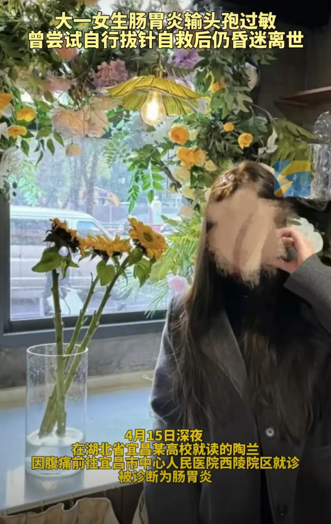 4月15日深夜,在湖北省宜昌某高校就读的陶兰,因腹痛前往宜昌市中心人民医院西陵院区就诊,被诊断为肠胃炎。医生给她开了头孢曲松钠,输液一会儿后陶兰感到呼吸急促,在4分钟前,护士为其换上药后匆匆离开,陶兰自行拔针自救,仍在输液椅旁昏迷。陶兰最终仍因过敏性休克、多脏器功能衰竭,于4月20日抢救无效离世。(闪电新闻)