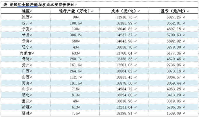 通过对比近两期中国电解铝成本比重变化,主要体现在氧化铝方面,原料氧化铝价格较上月再度下跌,电价变动不大,预焙阳极价格上涨,电解铝生产成本小幅下降,而电解铝价格下跌,企业利润空间缩窄。从卓创资讯跟踪的全国各省份的加权生产成本情况来看,成本最低的企业集中在新疆、内蒙古、云南地区,成本最高的是福建地区。